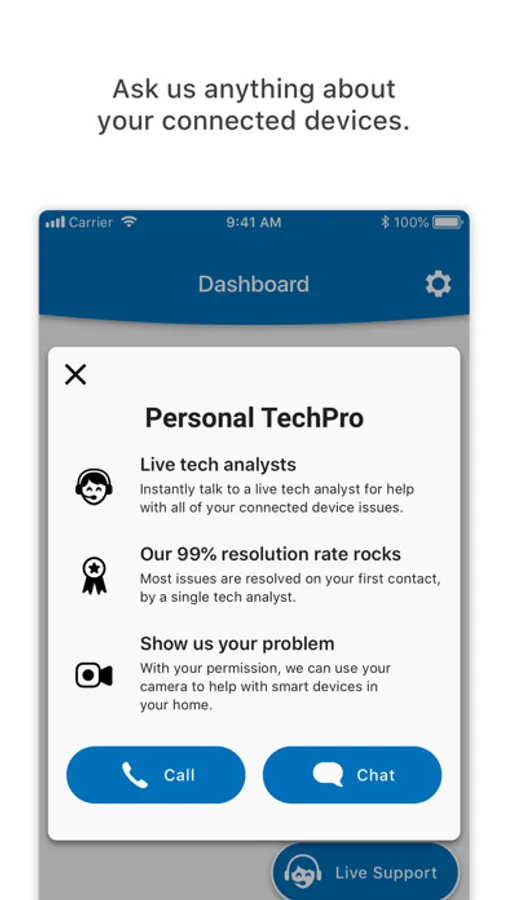 • Connect instantly with our U.S.-based tech pros via call or chat for support of all your connected devices such as smartphones, printers, routers, game consoles, smart TVs, and thermostats.