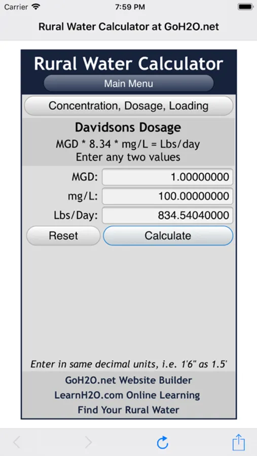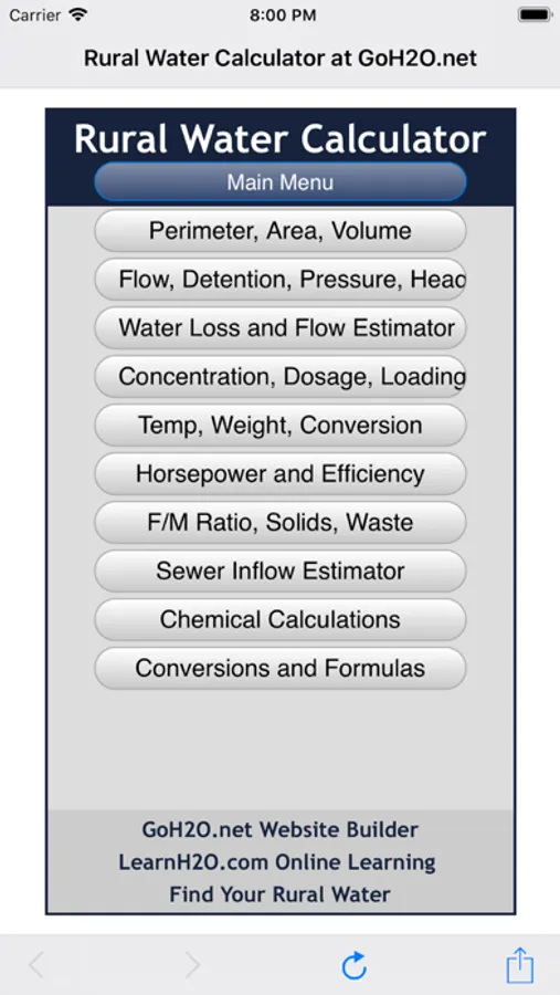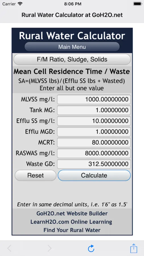 This calculator for the Rural Water community include every formula and calculation ever needed for water and wastewater utility operators. Calculation categories include perimeter, area, volume, flow, detention, pressure, head, water loss and flow estimation, concentration, dosage, loading, temperature, weight, common conversions, horsepower, efficiency, F/M ratio, solids, wasting, sewer inflow estimation, chemical calculations, and process efficiency.