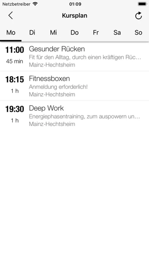 Direkter und aktueller Zugriff auf den Kursplan von überall: Für jeden Kurs kannst Du Details wie Zeit, Kursbeschreibung, Raum und Merkmale wie z.B. den Schwierigkeitsgrad einsehen.