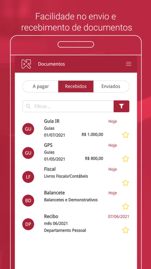 Com uma interface simples e recursos intuitivos, o eContador disponibiliza para seus clientes, a visualização de seus documentos e a possibilidade de considerá-los como pagos e favoritos, com agilidade e simplicidade.