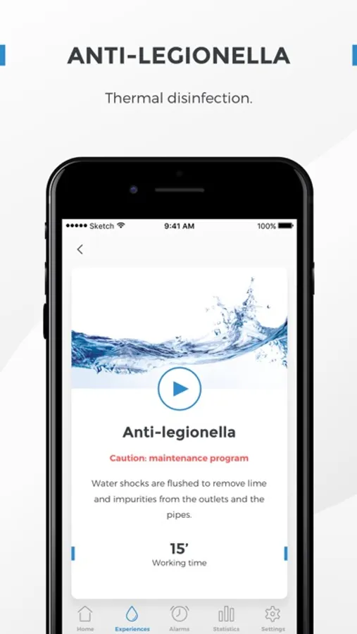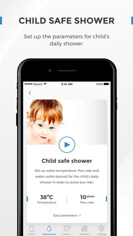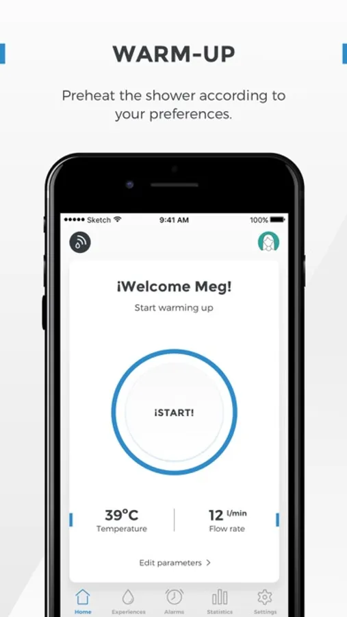 parameters and start the smart functions of the shower: Warm-up & Alarm: Preheats the