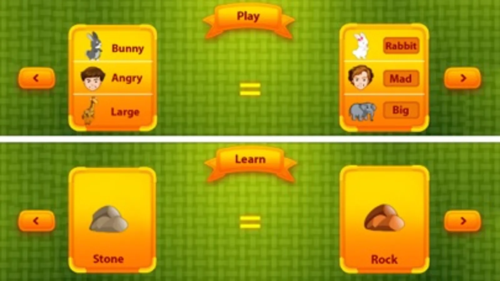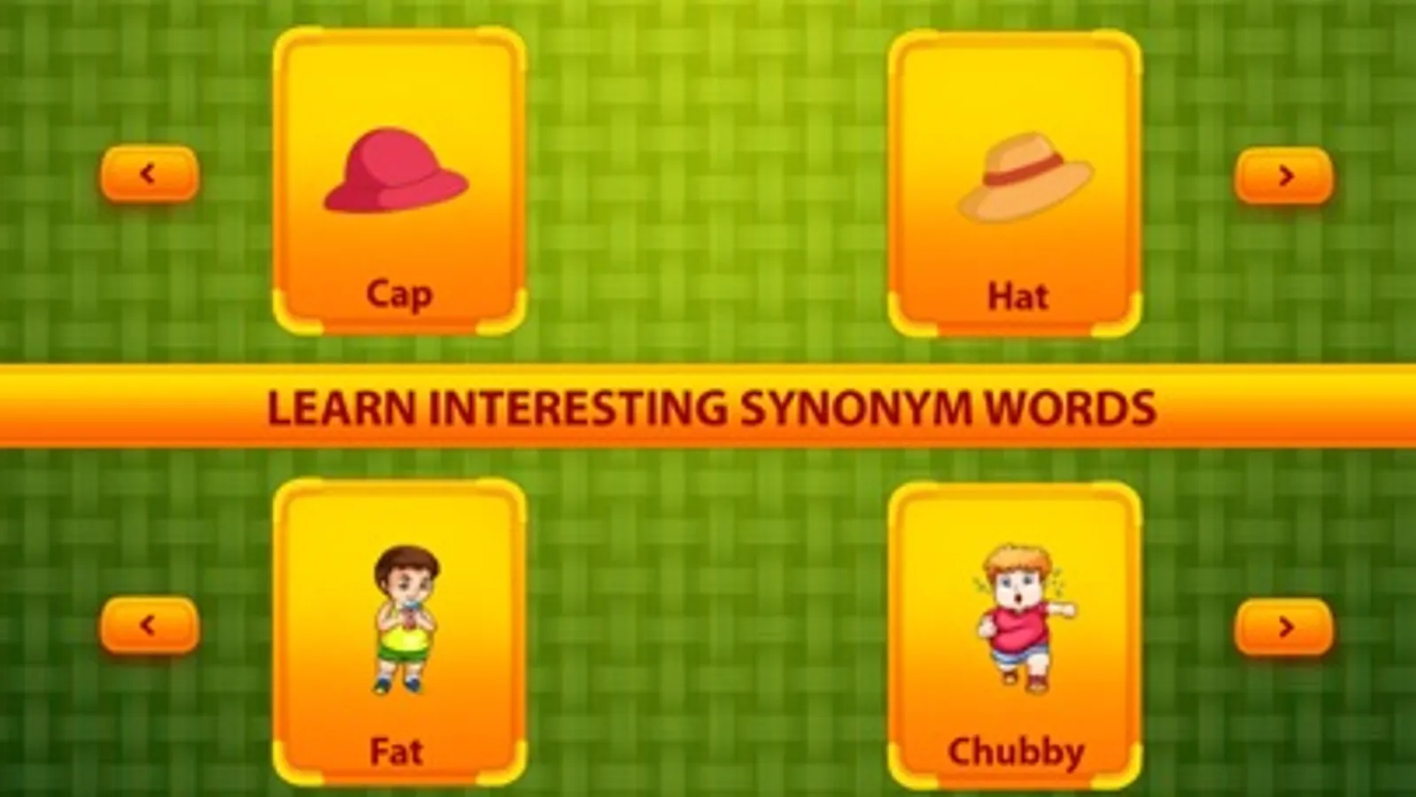 Synonyms Words For Kids gives us two Modes "Learn Mode" and “Play Mode"... Learn Mode helps your kids to learn the magic words. Play Mode test your kids skills on identification and memory.