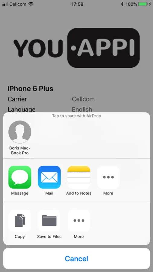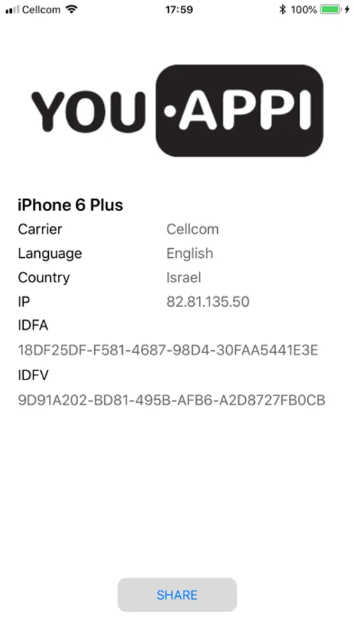 Device Detective by YouAppi is a free tool to fetch your device's details: device name (how it is known in the market), language, carrier, country, IP address, IDFA, IDFV. No need to search through websites and device's settings - just launch the app and get all the details.