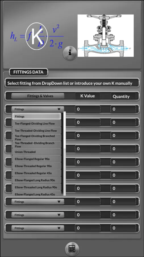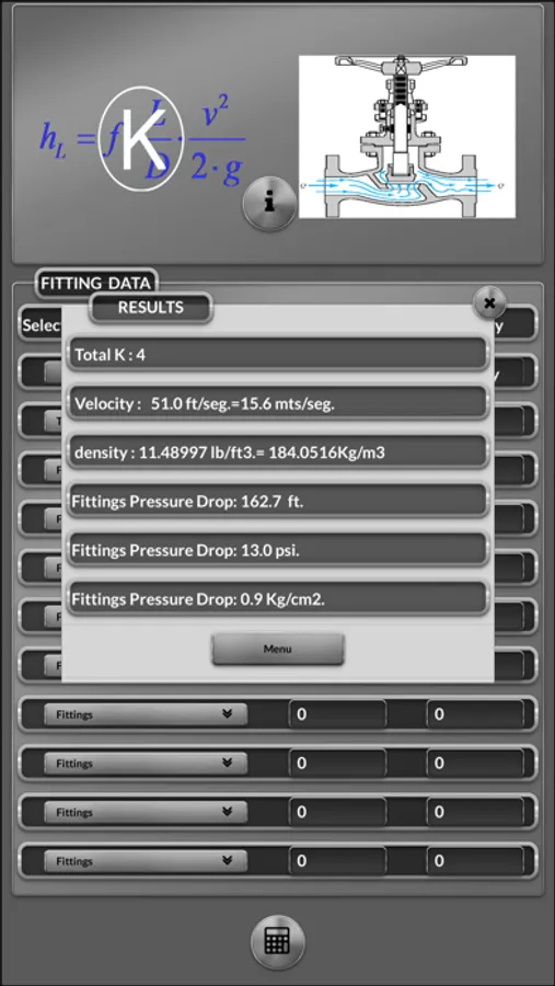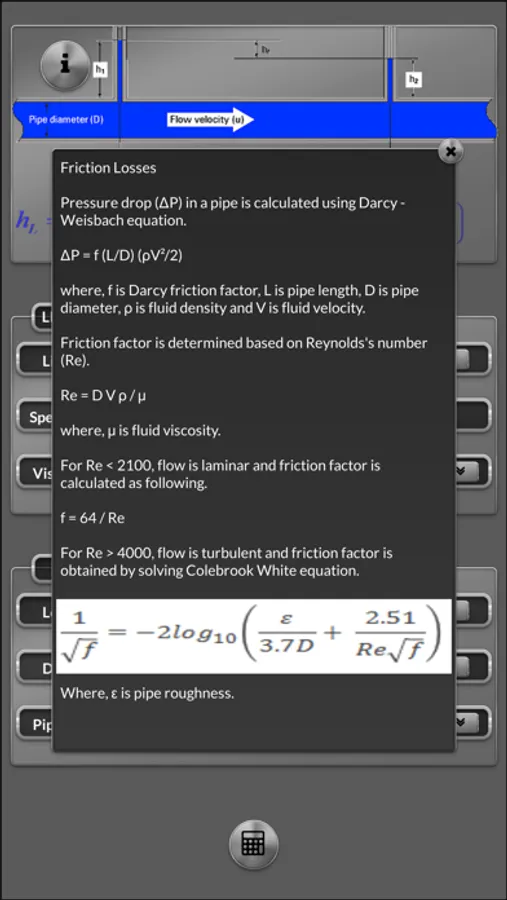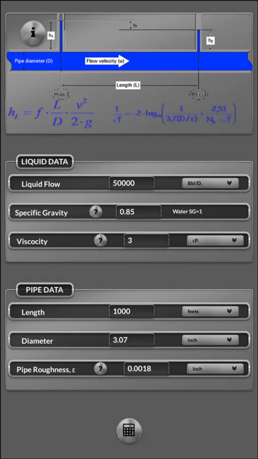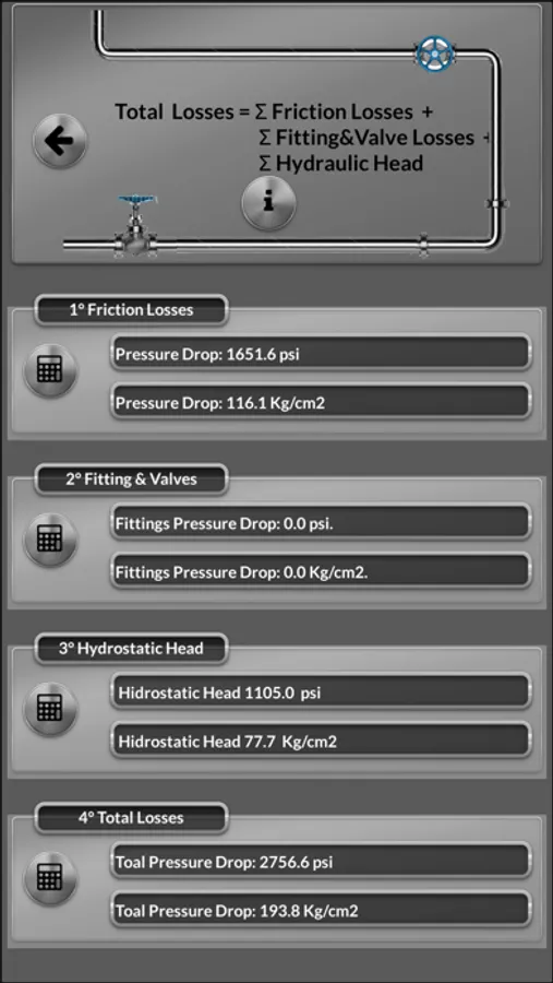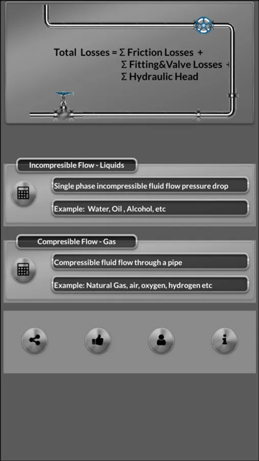 With this app you can calculate the pressure drop due friction losses in pipes and "minnor losses" due fittings and Hydrostatic Head for incompressible fluids and compressible fluids flow.
