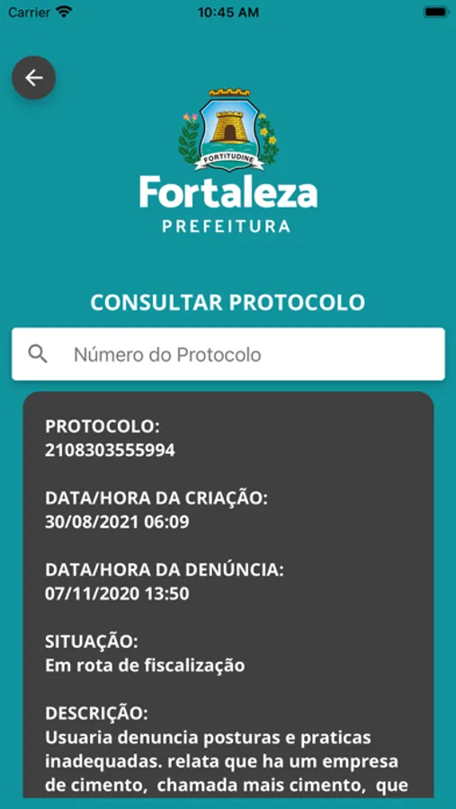 O usuário pode acompanhar também a demanda gerada. Basta inserir o número do protocolo e verificar qual o status da denúncia.