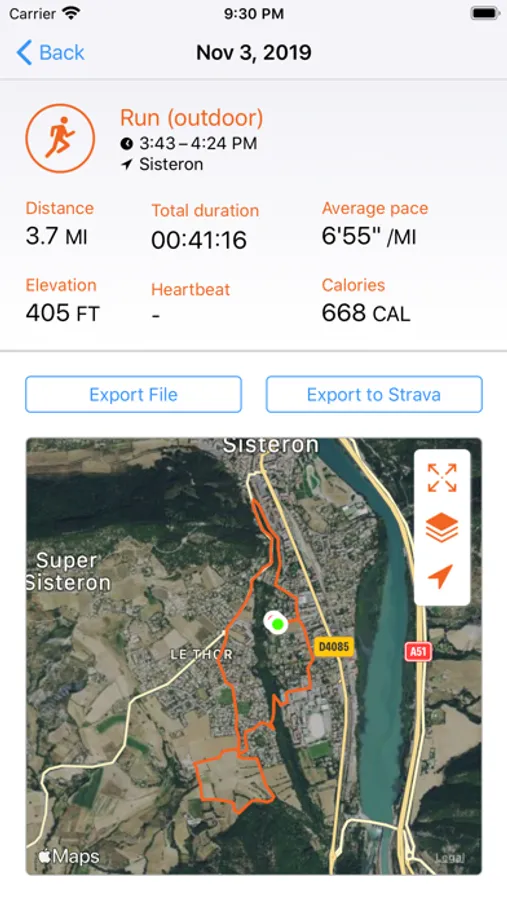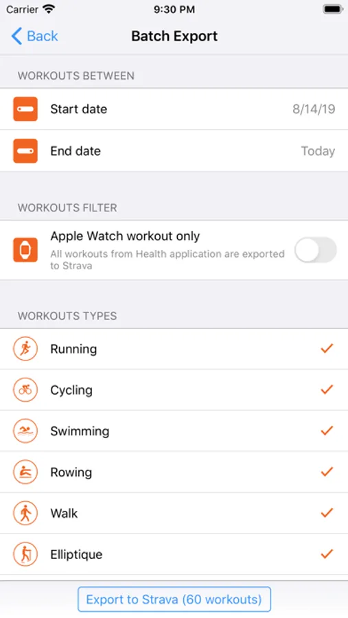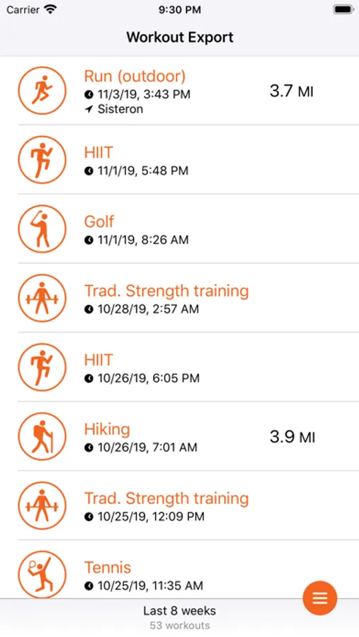 ● Export any workout visible in Health app, including the one created by a third party tracking application.