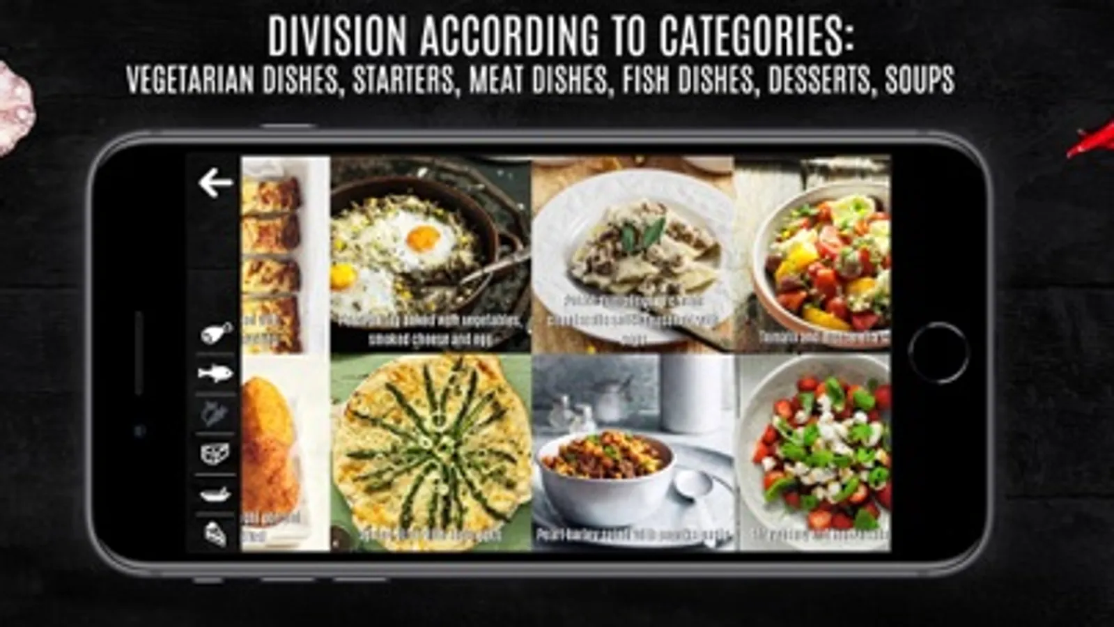 - division according to categories: vegetarian dishes, starters, meat dishes, fish dishes, desserts, salads, soups