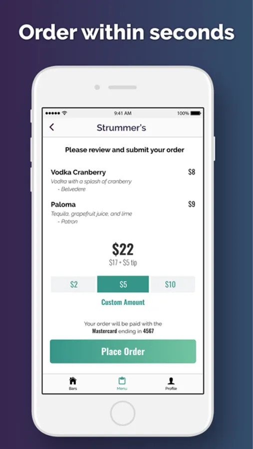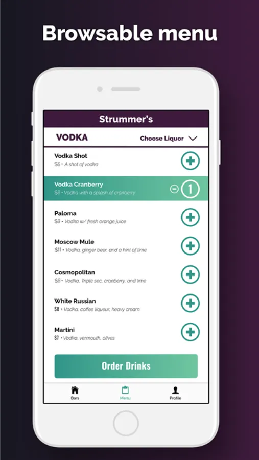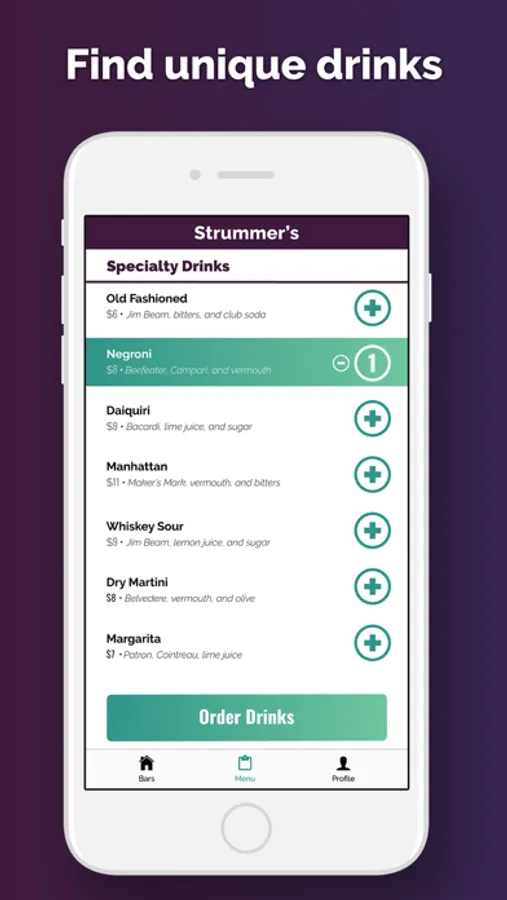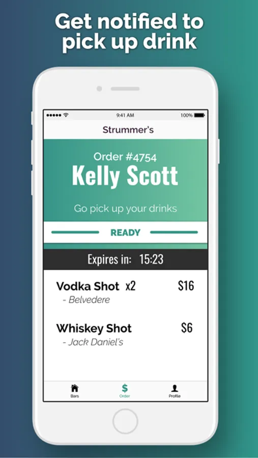 Order drinks from you phone and forget about opening a tab. Now you can chill with your friends while your drink is being made and simply pick it up when it's ready. Show the bar tender your "Drink Ready" screen and they will check your ID and hand you the drink.