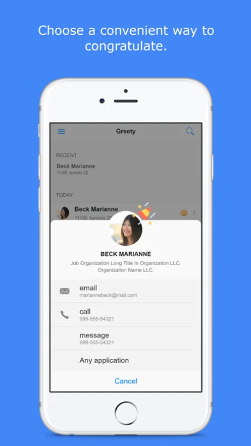 After choosing a contact for greetings you can send your wishes in any convenient way – via email, WhatsApp, Messenger, iMessage, etc. Or even make a call to make greetings personally :)