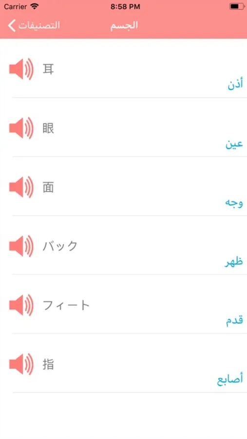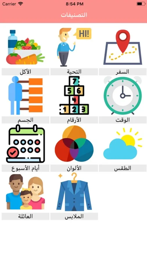 ـ كل قسم به عدة كلمات وجمل وبالصوت وترجمة للعربية
