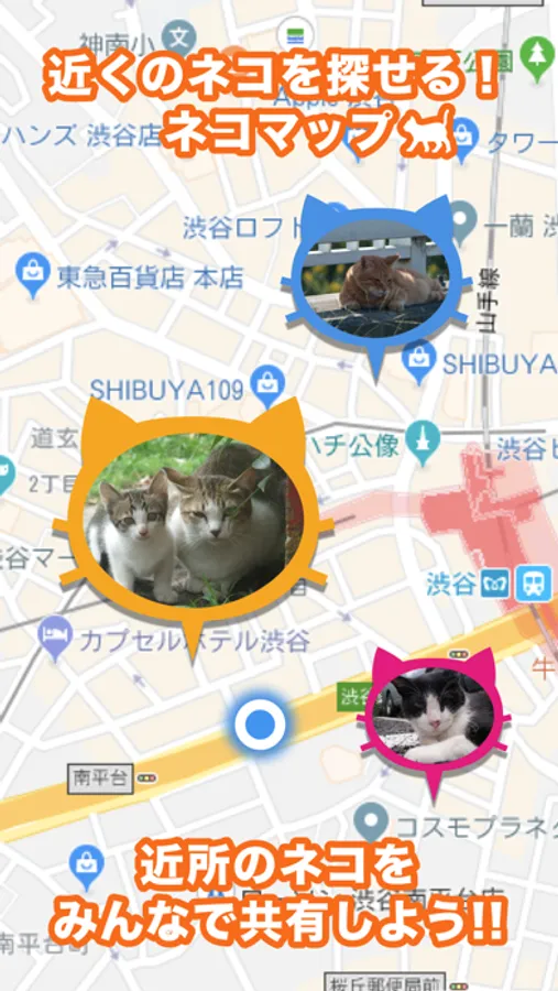 『ねこさがし』は、あなたの近所の飼いネコや野良ネコを、みんなで共有して癒やされるアプリです!