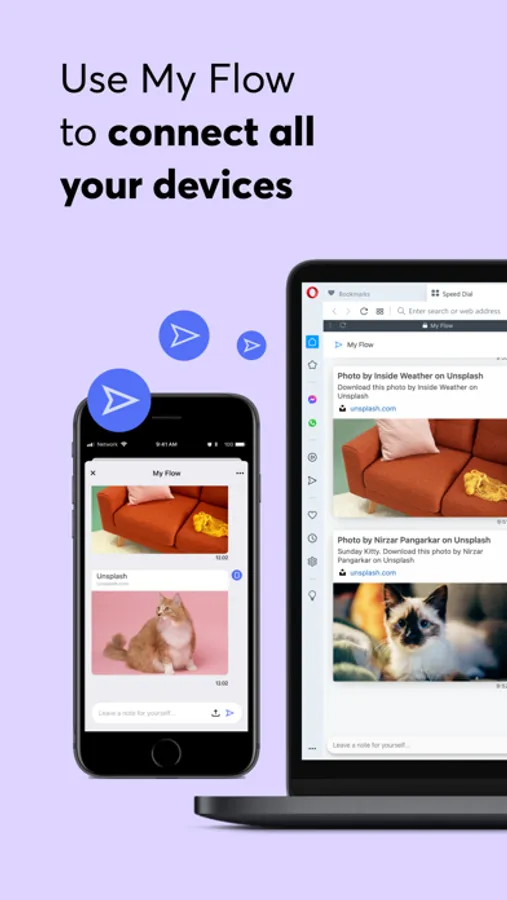 Use Opera for Mobile along with your Opera computer browser for seamless web browsing and fast file sharing across your Desktop and Mobile devices. Connecting your phone with your PC to share files has never been easier. Just start the Opera desktop browser and scan the QR code displayed there with Opera Browser. No login, password or account needed! You can send links, notes, videos or any other files to yourself with a single click and they will be displayed on all of your desktop and mobile devices..