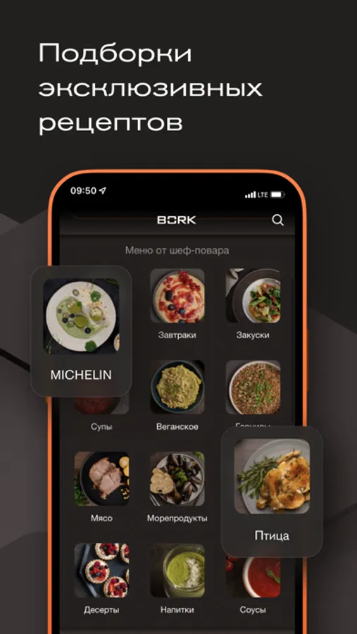 - Более 350 рецептов разных категорий блюд, разработанных бренд-шефом BORK и шеф поварами, отмеченными звёздами Michelin.