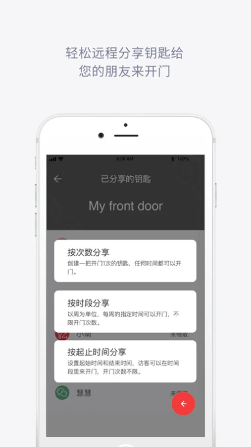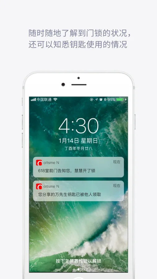 You can send the key remotely to your friends to open the door, or you can send a key with permission restrictions, sharing by times, sharing by start time and sharing by time period. Users can use oitsme app or a third-party app to get the key and unlock it, and also you can receive push notifications for key usage.