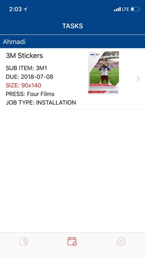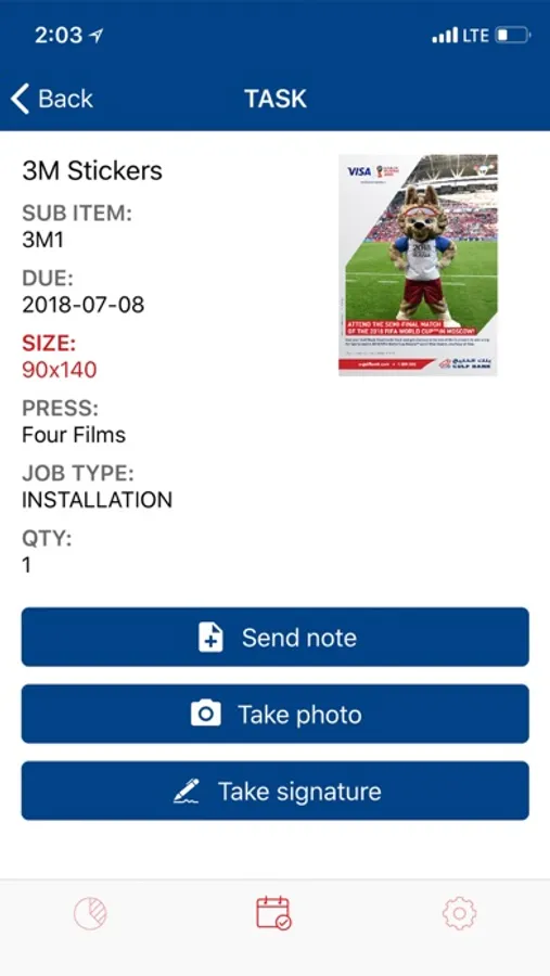 This Gulf Bank application tracks real-time in-branch installation of collaterals whereby the supplier conveniently and efficiently completes the job and provides the client with real-time updates and relevant descriptions of the installed collateral and general in-branch media at hand. Upon completing the installation in the designated branch, the supplier will take a photo of the installed collateral and share it with the client with the real-time location of the branch and the supplier's exact location. This tool makes it efficient and effective for the supplier to receive immediate feedback due to the real-time photo of the installed collateral as well as a foolproof way for the client to stay up-to-date on all newly installed in-branch collaterals and media and thus provide the supplier with instant responses and approvals.