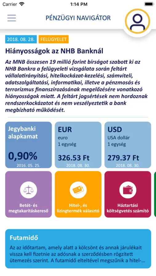 A Magyar Nemzeti Bank Pénzügyi Navigátor mobilalkalmazása a mindennapi életben hasznos pénzügyi információkkal, kalkulátorokkal és keresőkkel segíti a tájékozódást.