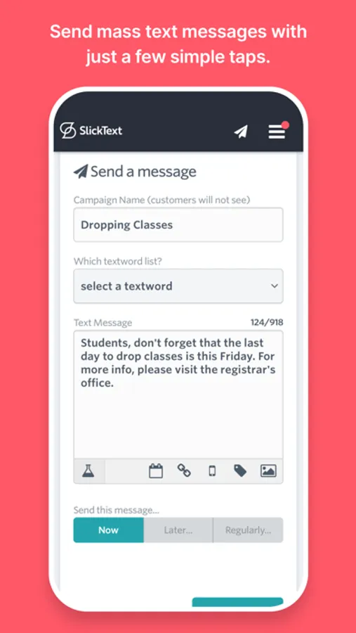 SlickText provides business and organizations with the ability to market and communicate to people at scale via text messaging. Whether you’re a business owner looking to boost revenue or communications director looking to get the word out to your people, SlickText provides a feature rich and easy to use platform for reaching your target audience.
