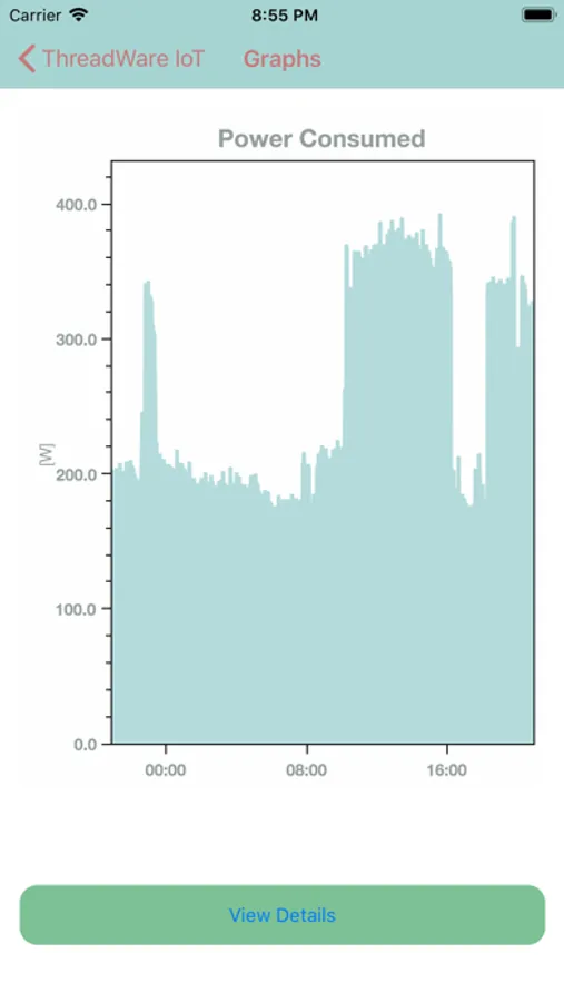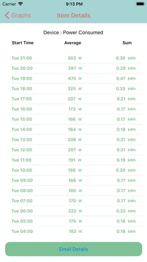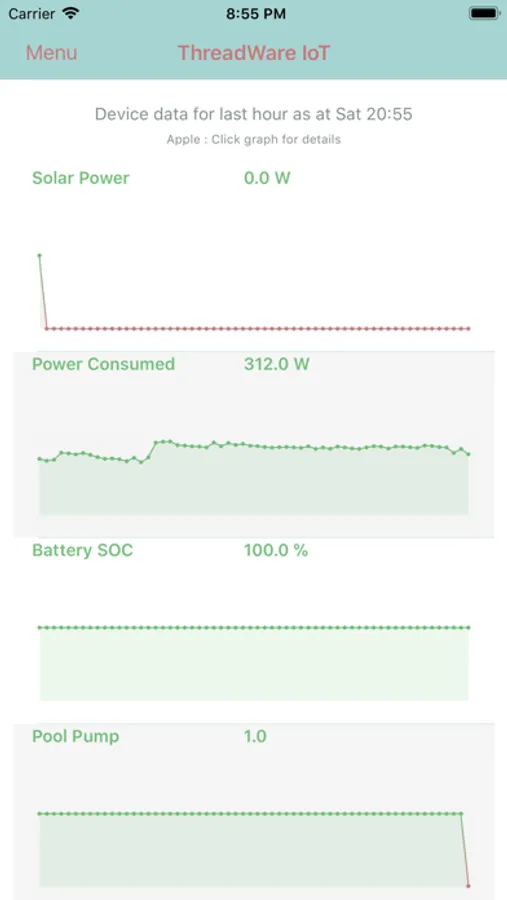 Once logged into the app, you will by default see a graphical list of your devices data representing the last hour of data (for example power consumption).
