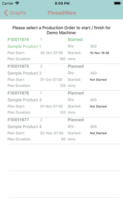 If you have setup your ThreadWare devices for production management, additional buttons are displayed on the detail graph page which allow you to start or stop a production order or start / stop a machine breakdown against a production order. On clicking either of these buttons, a page is displayed which lists all currently active production orders which can be started or stopped by clicking on the appropriate order.