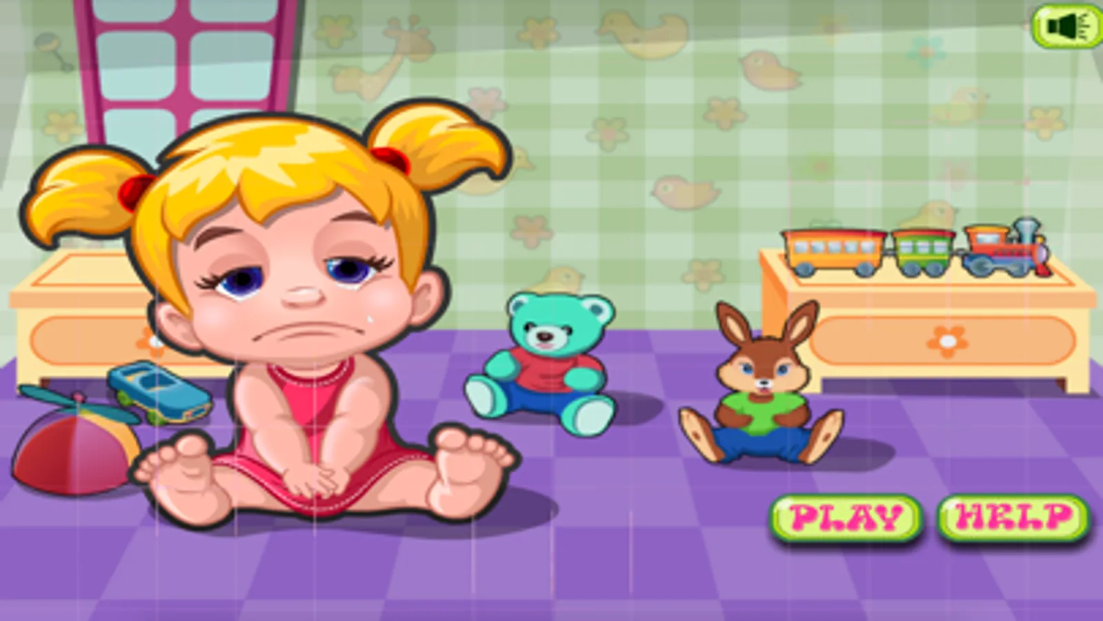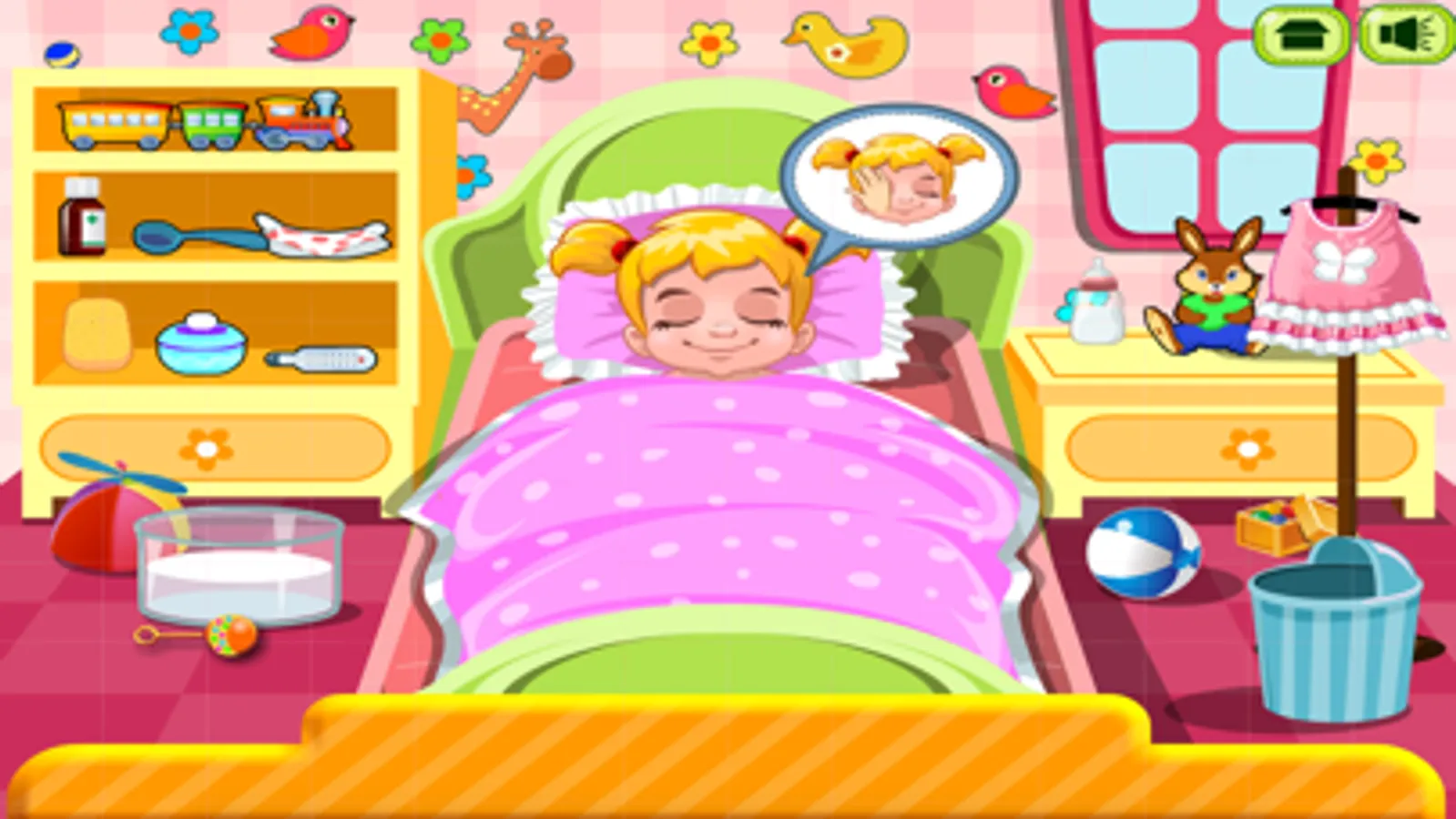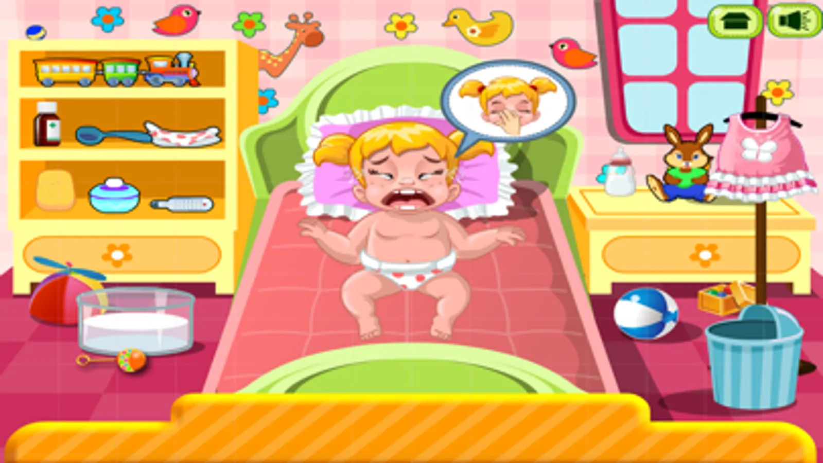 Oh pour little baby… she’s feeling sick today! Baby woke up with a bit of fever so her mom needs the help of super talented babysitter with medical skills to take care of her - can you ladies help out? First of all, check her body temperature and then decided on the medicines that would help her feel better. Give her a spoonful of syrup to control her fever and then move to the next page of the game and change her dirty diaper! Carefully remove it and place it in the dustbin, apply some bits of a delicate baby powder and see if you can place a brand-new diaper. Great job, ladies! Now since she’s feeling way much better, dress her up in a cute baby dress and then pick up the bottle of milk and feed the cutie pie! Have a great time playing this brand-new baby care game.