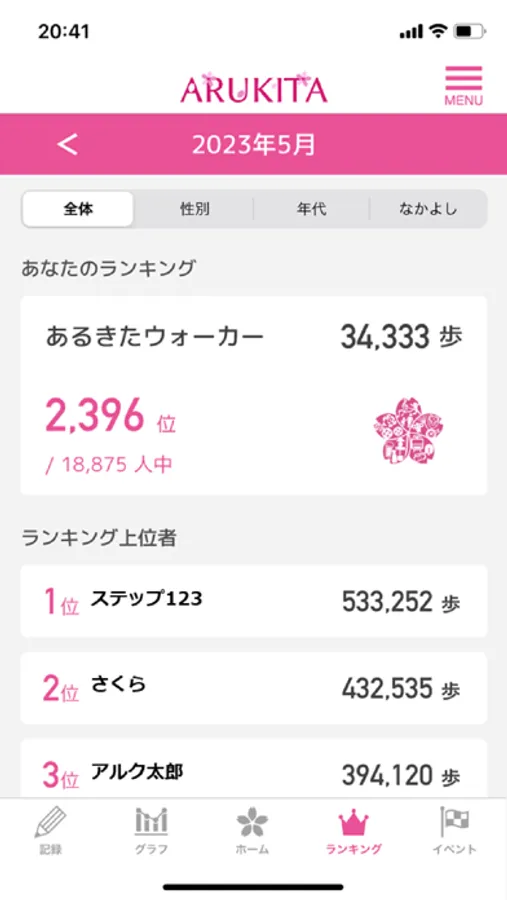 ⑥アプリ内の全体・性別・年代別の歩数ランキングを表示