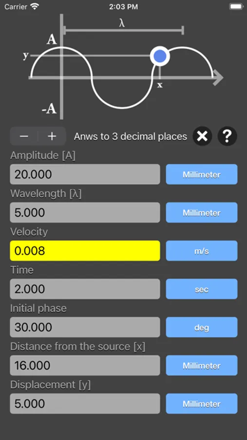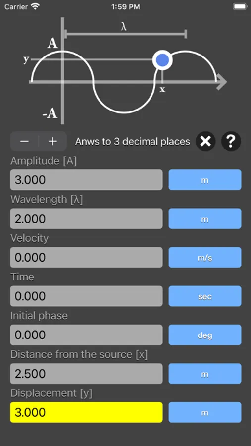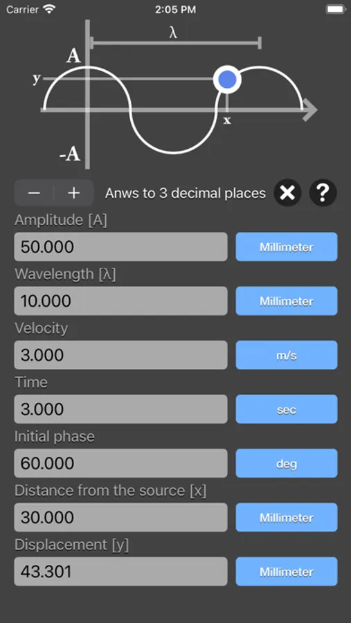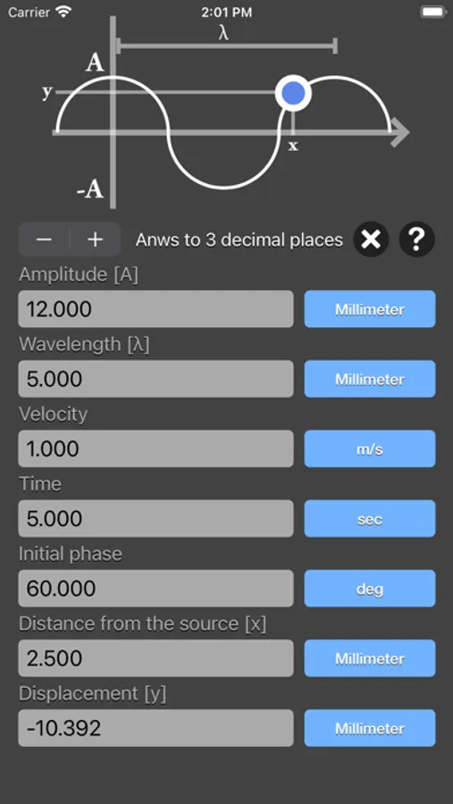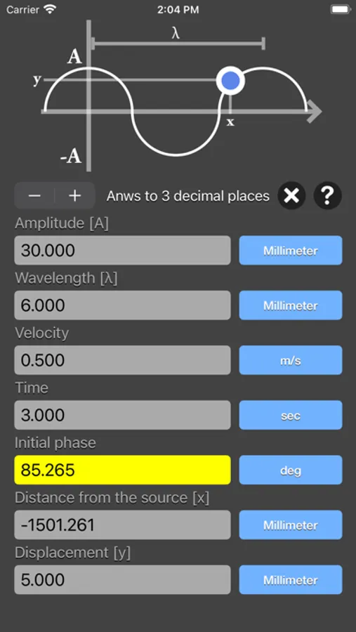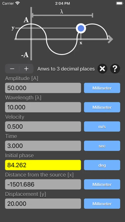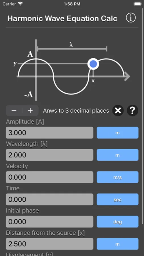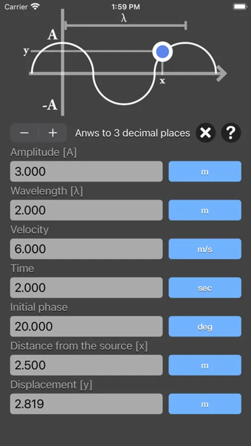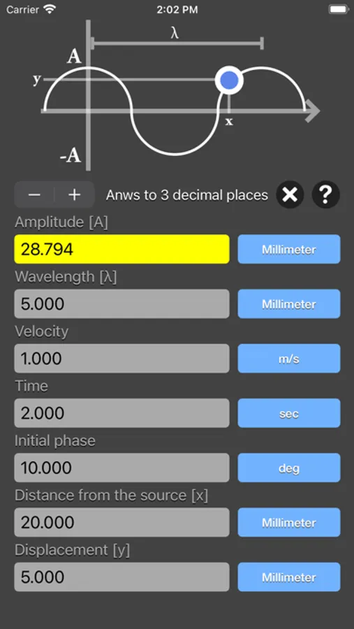 Harmonic Wave Equation Calculator are physic/math calculator to find displacement of a given point along the wave, position of that point, time point, wave velocity, wavelength, amplitude or initial phase of the wave fast and easy.
