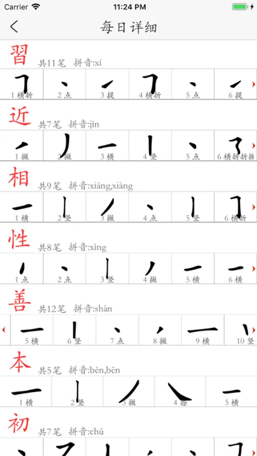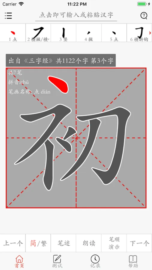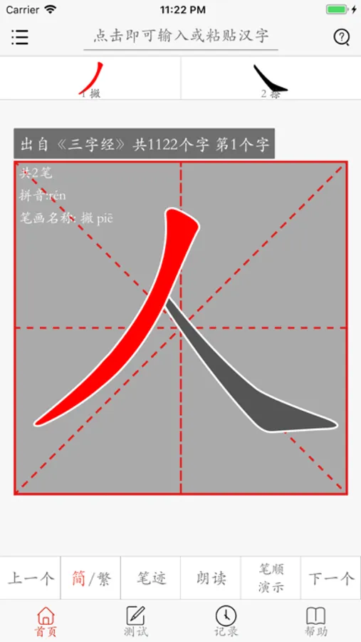 Chinese character stroke (strokes order) and strokes depicting red copybooks, which are suitable for the second and first semester of elementary school to learn the radical and radical structure of Chinese characters and the strokes and strokes of strokes (strokes), and can perform strokes (strokes) strokes, Test and query tool App.