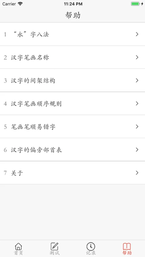4. In the "Help", provide some basic knowledge of Chinese characters, such as the name of Chinese strokes (strokes), the structure of Chinese characters, the rules of Chinese characters, the structure of radicals, and the erroneous strokes (strokes), stroke order, etc. Your reference.