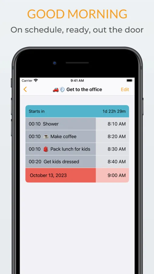 The morning sets the tone for the rest of your day, and setting a Countdown to smooth things out gives you back the energy to enjoy the time with those you care most about. With a morning Countdown, you'll be confident as you head out the door that you didn't miss things like: packing lunch, exercising, getting laundry started, or walking the dog.