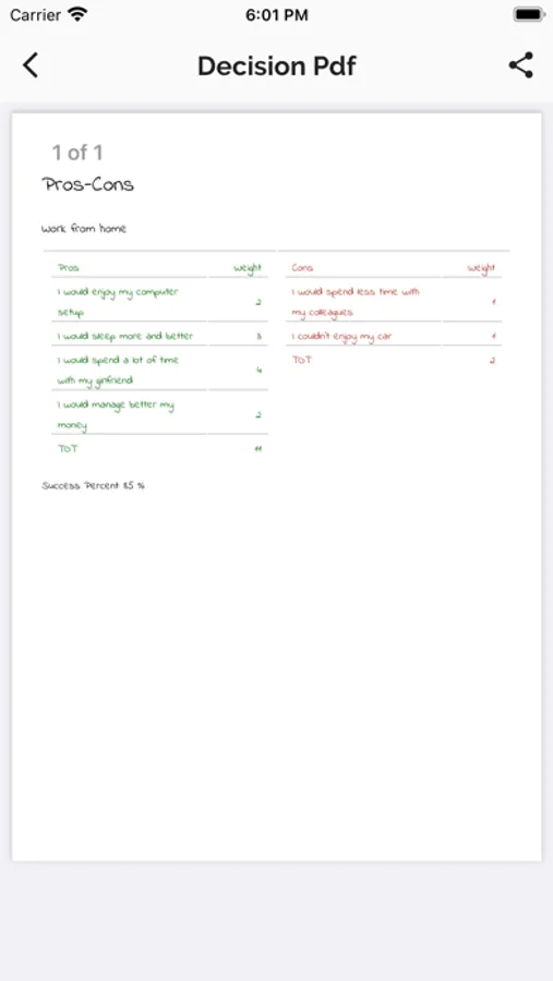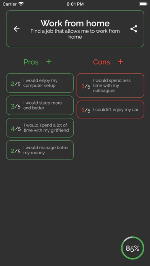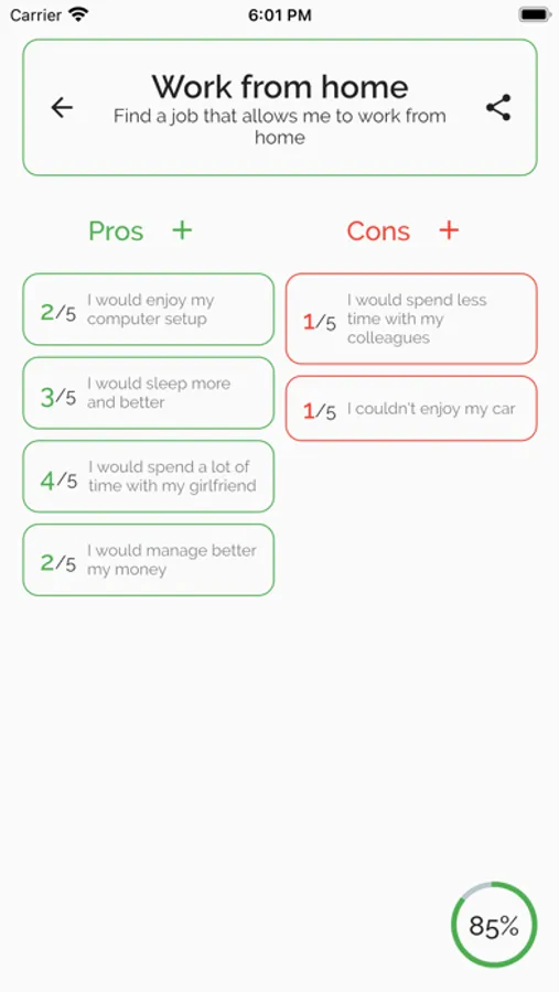 Once you have added all the advantages and disadvantages, the application will analyze the points you have entered to suggest whether or not to take the decision.