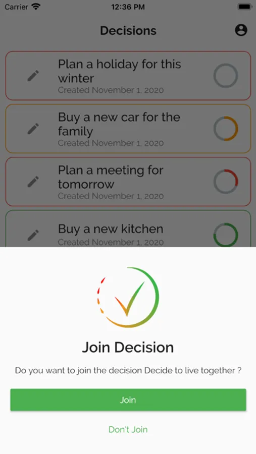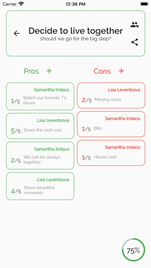 Now you can create a collaborative decision, and you can share it via link with your favorite messaging app or on your social page! The users can eventually download the app and join your decision, adding pros and cons.