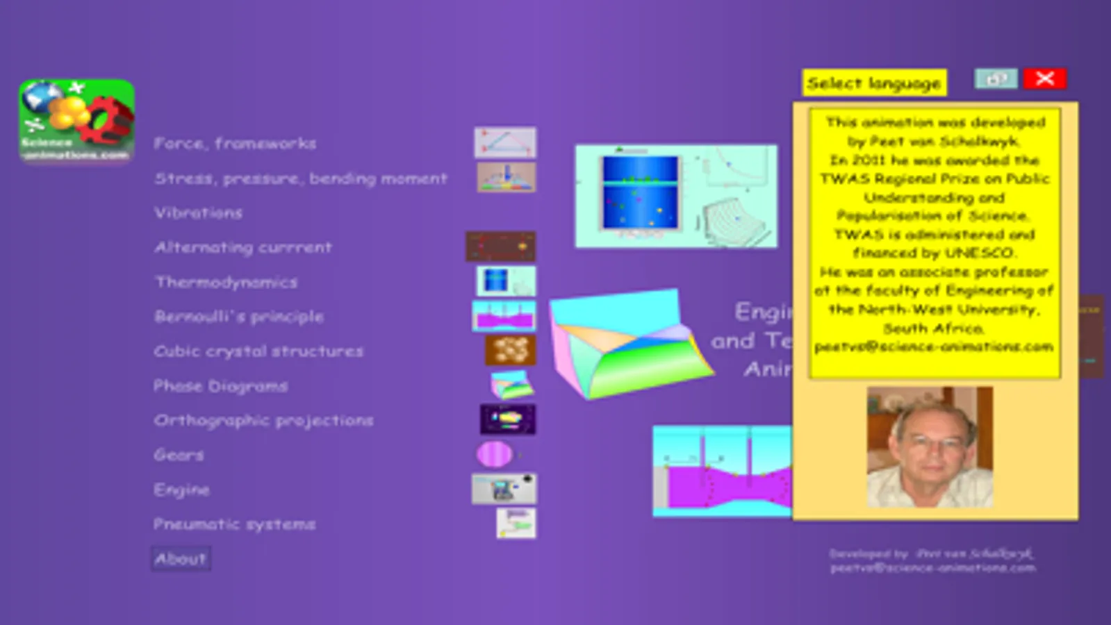 Science Animations: Engineering and Technology animations is for learners in technical high schools as well as first year engineering students. This app will help them to get a better understanding of basic concepts in engineering. The concepts are explained in a visual, dynamic and interactive way. This app does not replace the teacher/lecturer or handbook but is a valuable additional source for teachers/lecturers. It is also important that learners should play on their own with this app.
