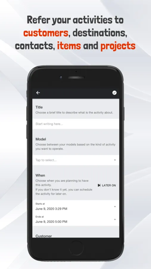 - Refer your activities to customers, destinations, contacts, items and projects and link all of them together.