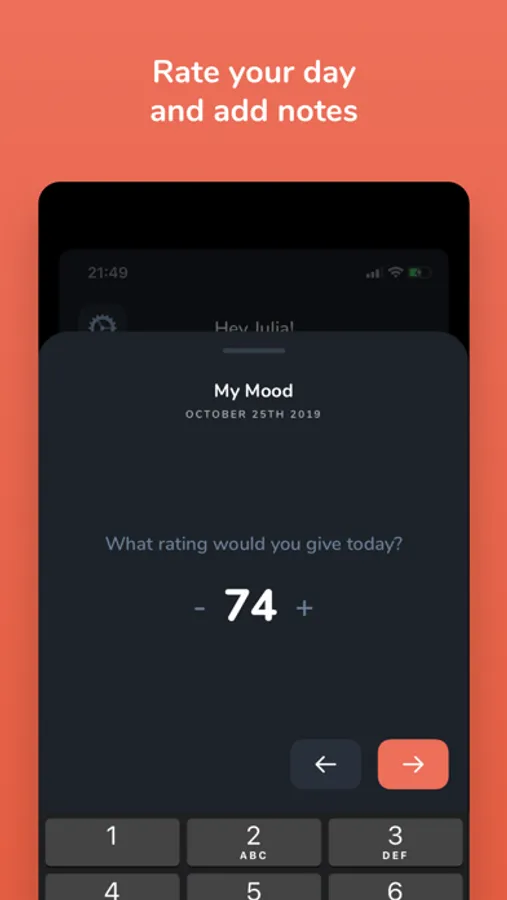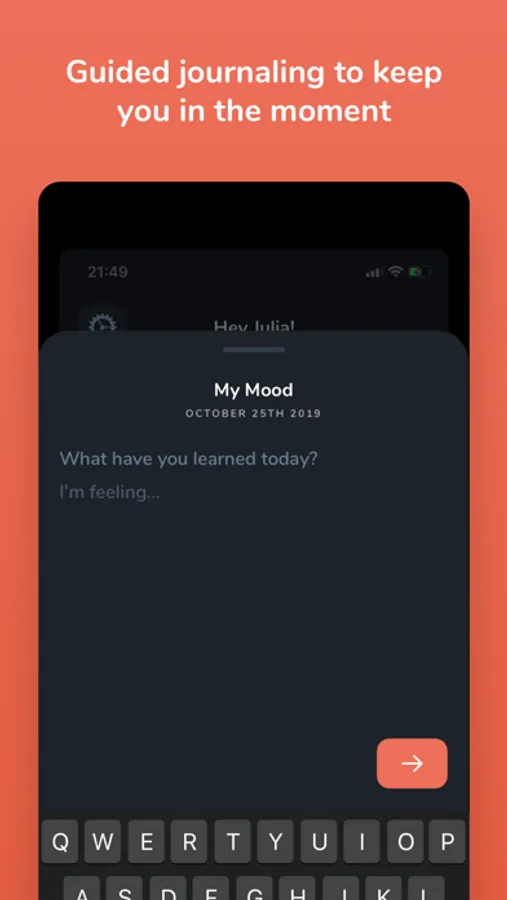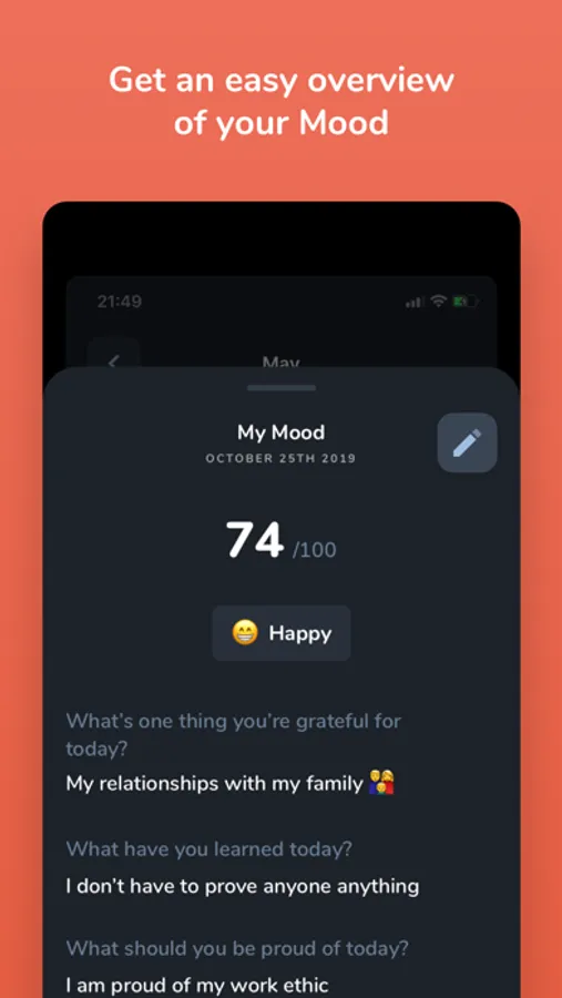 Living in the moment is the key to happiness and we help you with that. Mood is your personal mini journal: use it to reflect on your day with 3 questions to make you more present and the ability to rate your day.