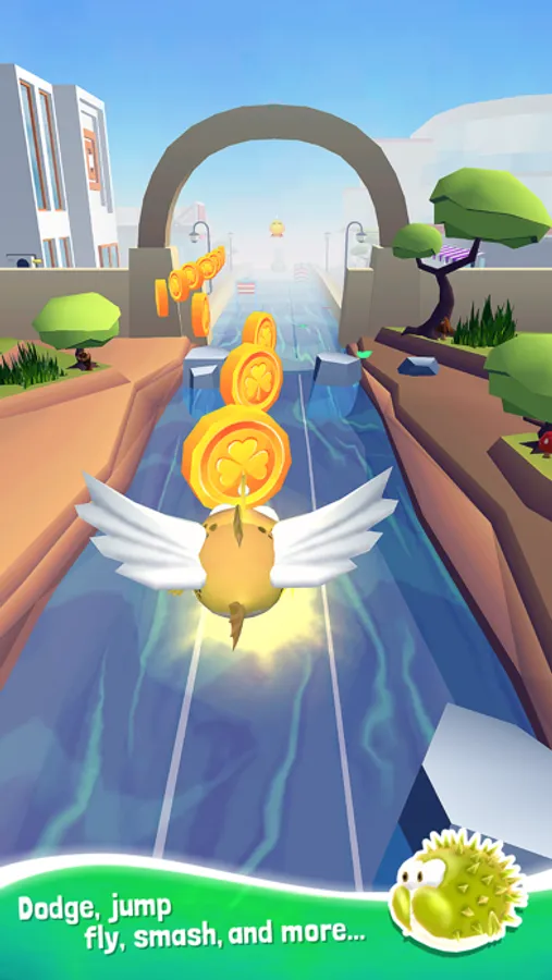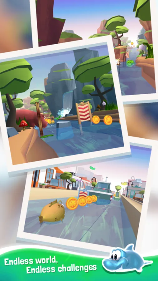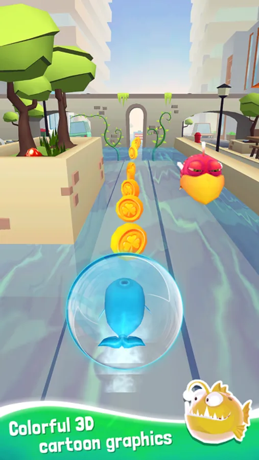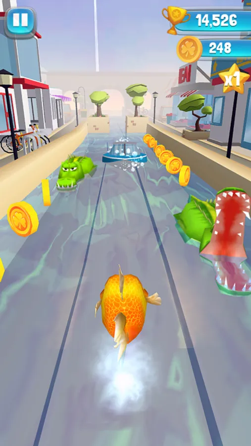 The game play is based on endless running frenzy of the hero Fish on the 3-lane water track. You have to help the fish hero to run, dash, dodge and jump obstacles, collect coins from the running track, and to stay safe from naughty enemies like grumpy hippo, hungry crocodile, angry bird, attacking machines, grouchy boats, etc.