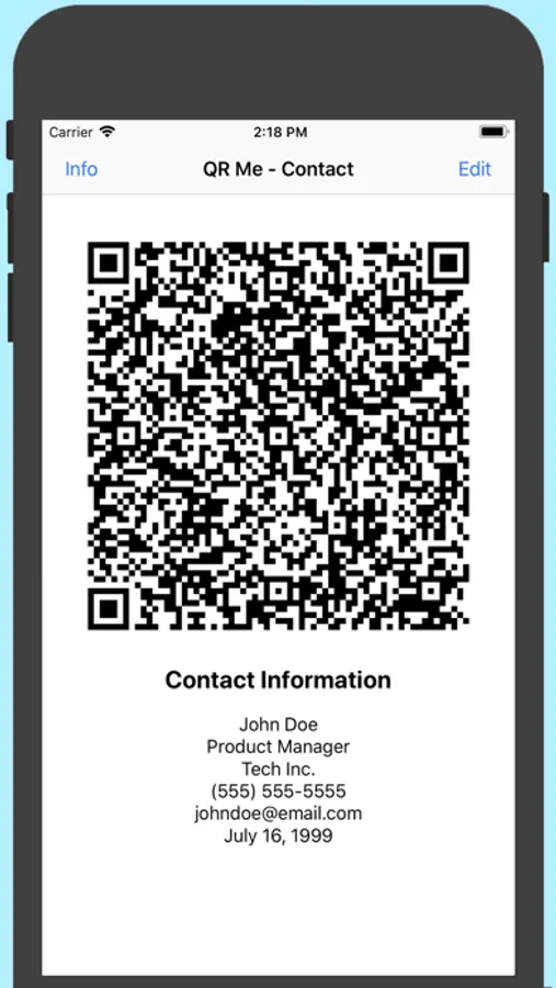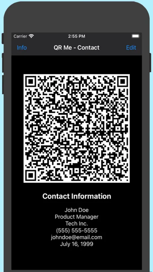 QR Me - Contact allows you to create your own personalized QR Codes to share your contact information quickly and easily with anyone. Simply have the other person scan your QR Code with their phone's camera and your contact will appear in their contact book.