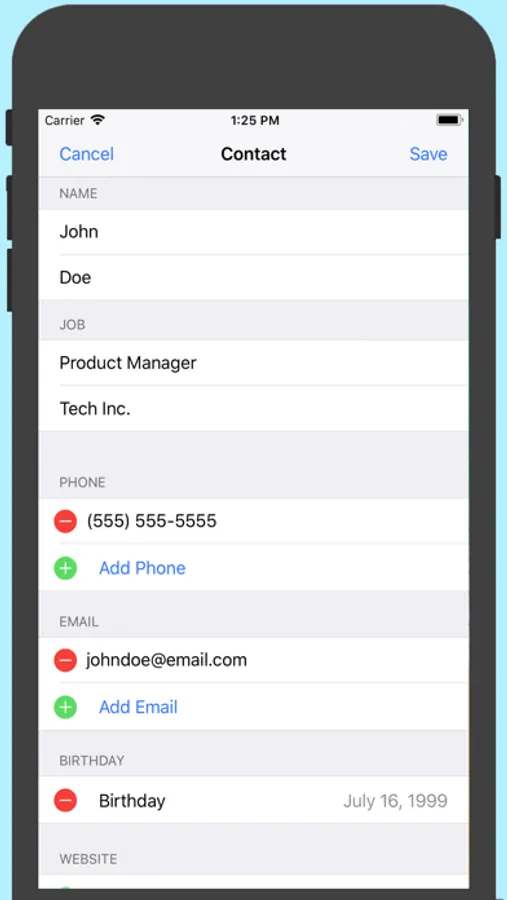 For phone numbers, emails, websites, and postal addresses, you can add labels to specify which ones are for work, home, etc.