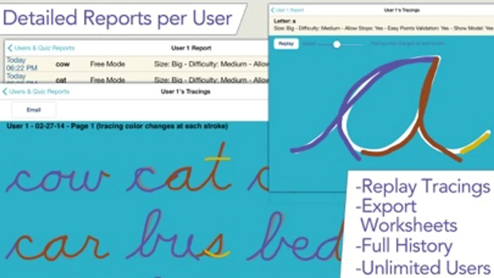 • Detailed reports provide information on what kids have done, including the ability to replay and export the tracings to view kids' progress