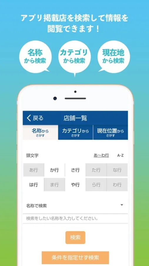 →「店舗名」「カテゴリー」「現在位置」から店舗を絞り込み!