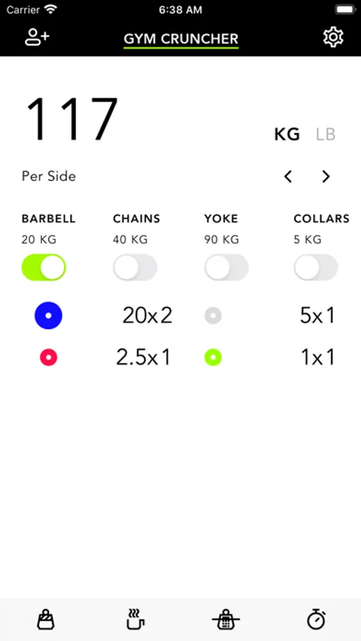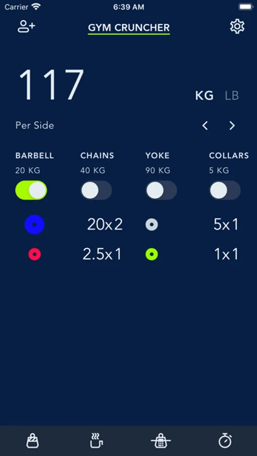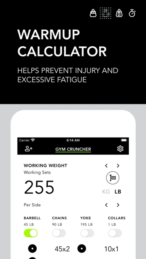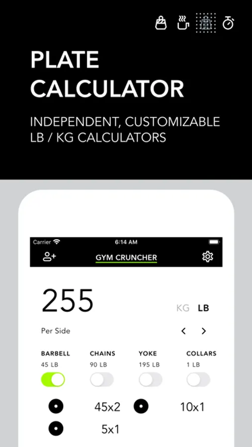 At the heart lies an independent, customizable LB/KG plate calculator with customizable tare switches, customizable plate inventories, and three plate loading options. Gym Cruncher includes a max rep calculator to help program training and discover optimal loading. The warmup calculator prevents injury and excessive fatigue. The science-backed rest timer optimizes recovery and ensures you're always resting within effective, studied ranges.