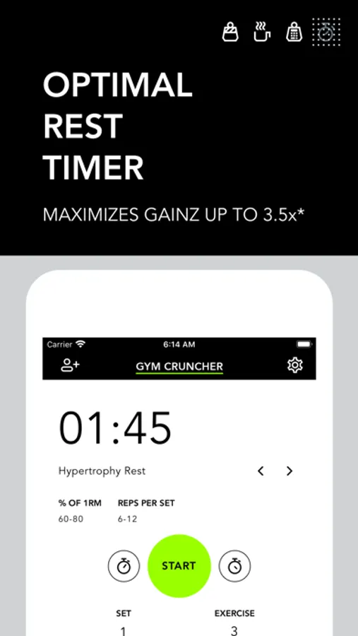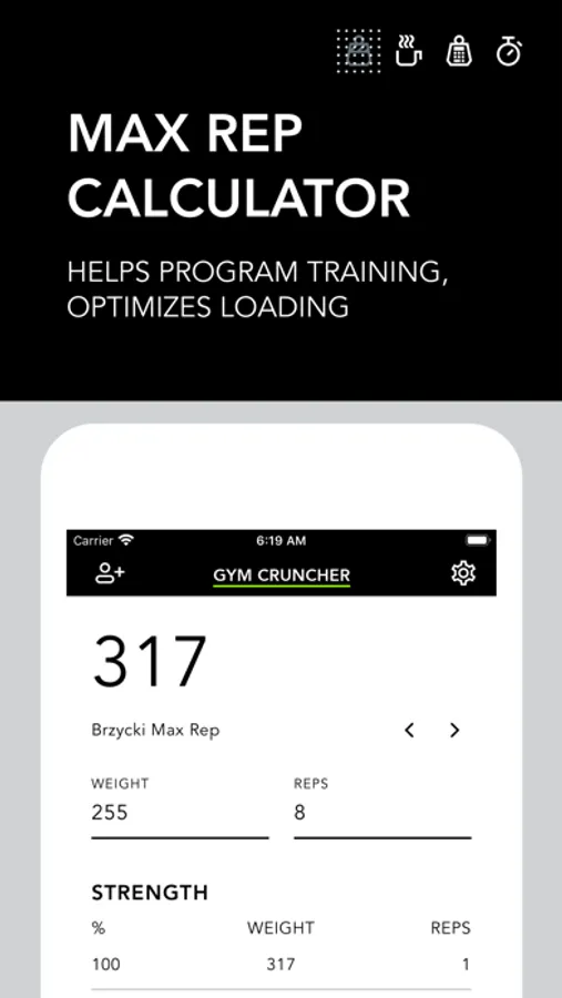 Gym Cruncher maximizes gainz and strength development. It includes four tools critical for lifters to speed up workouts, design effective programs, and optimize recovery.
