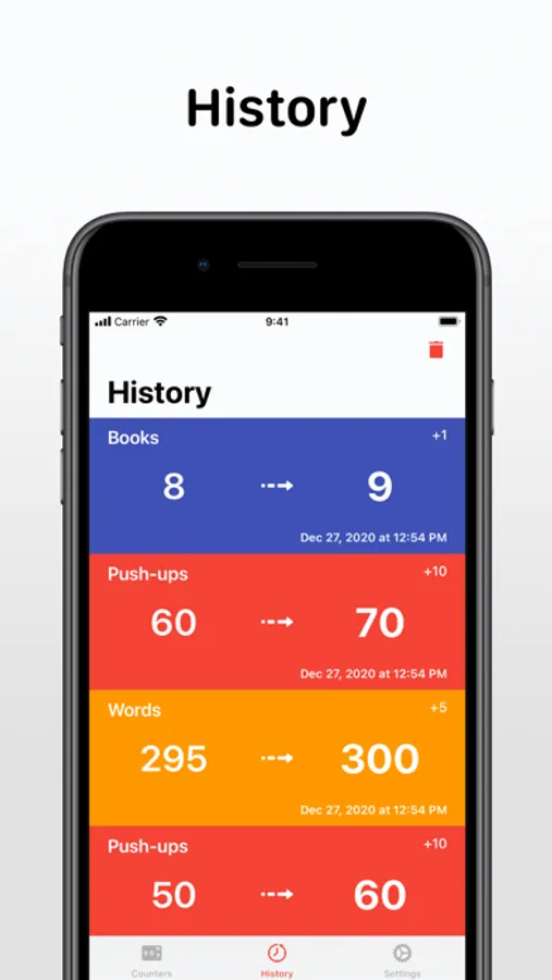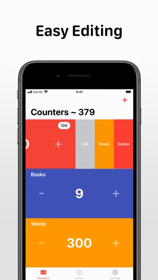 Multiple counters, as many as you need. To delete, reset or edit the counter, swipe left on it. Swipe right or use touch and hold gestures in the middle of the counter to add/edit a note or open a quick change popup. Notes can also be added/edited in the History tab in the same way as in the Counters tab. To increase or decrease the counter value, tap at any point on the left or right side of it. Use touch and hold gestures in the middle of the counter to reveal the context menu. Long press on the sides of the counter to reorder.
