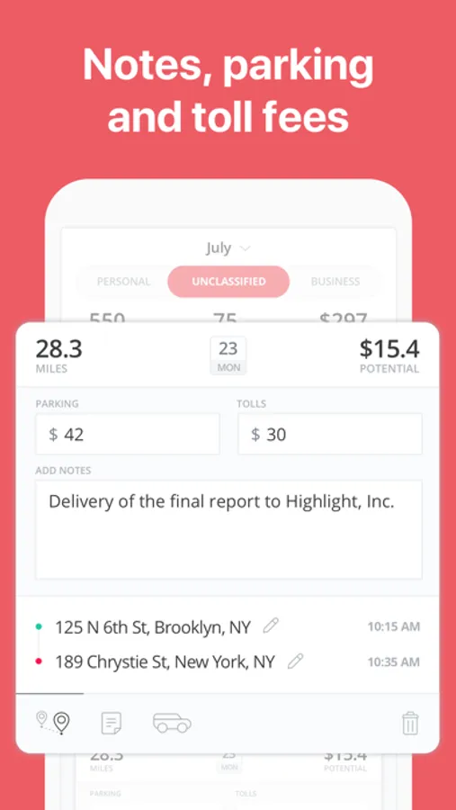 Stay organized and log notes, parking fees and toll fees for every single drive. Never forget important information on your drives and see how much you’re spending.