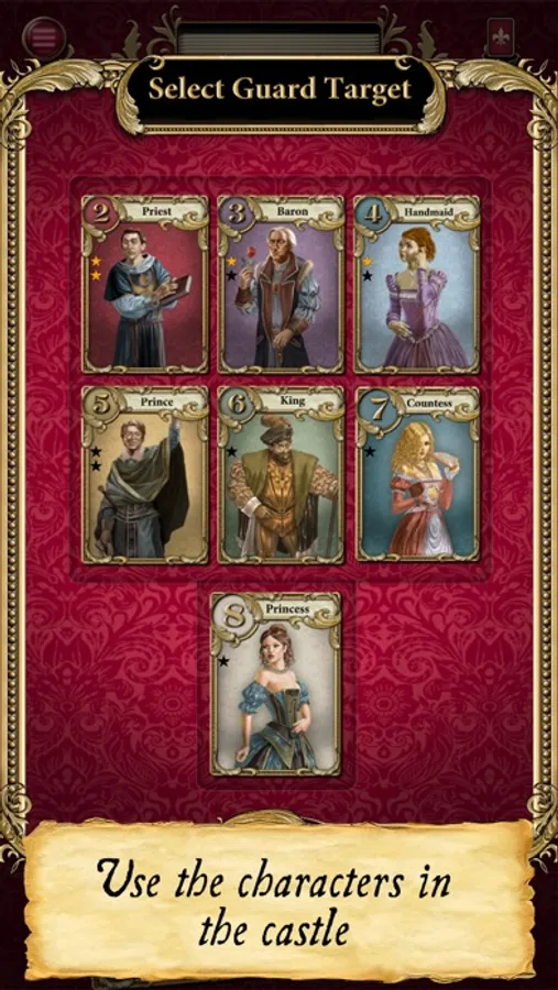 You only ever have two cards in your hand. Draw and play your cards to get closer to the princess. Everyone staying in the castle could aid you in their own way: guards and princes can help discredit letters from other suitors, priests will give you precious information about your rivals while the handmaiden will protect your letter at any cost!