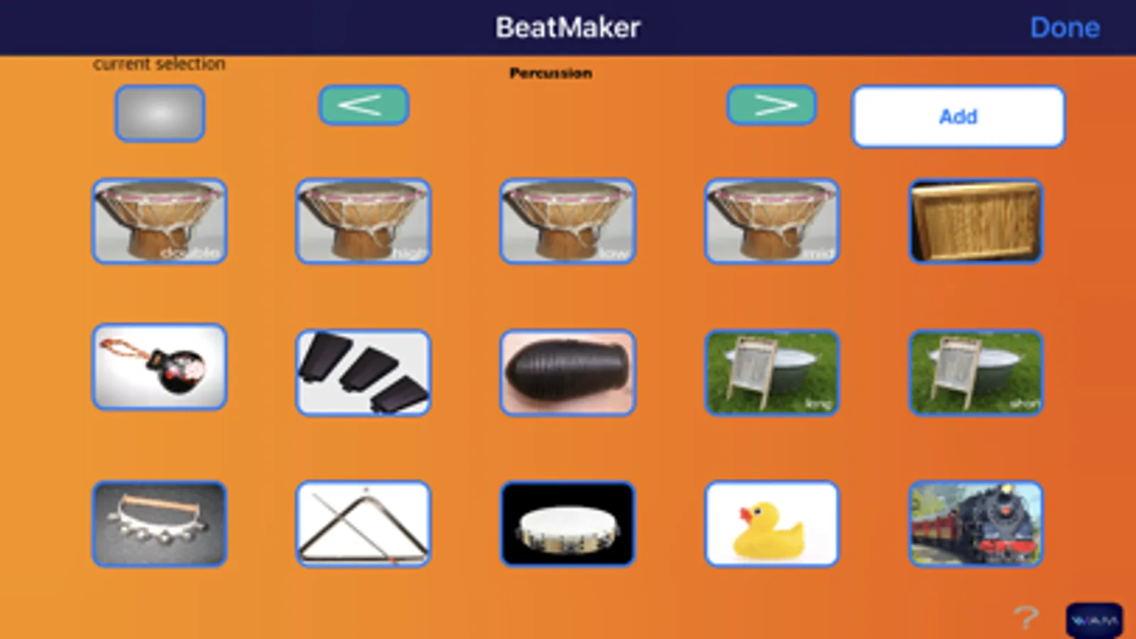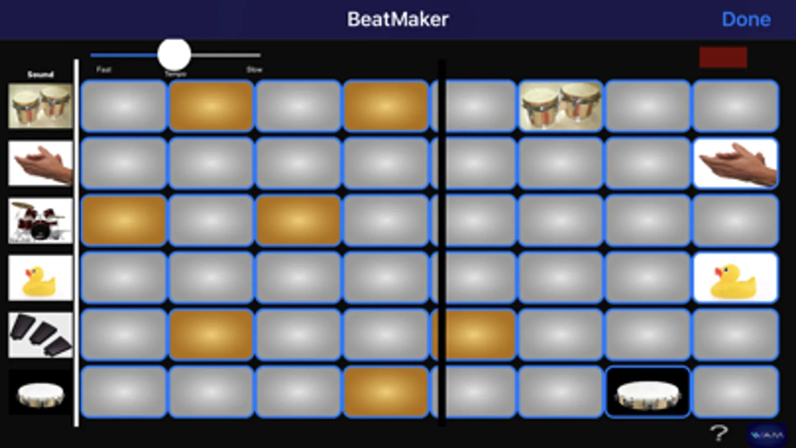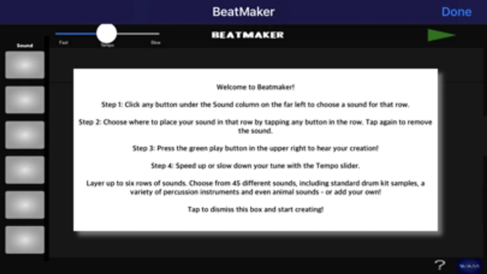Using BeatMaker is simple and fun! Click on the sounds you like, adjust the tempo and click play. BeatMaker features 45 different sounds from a variety of sources, including various types of drums and percussion instruments. But that's not all - BeatMaker includes quirky animal sounds so you can throw in a lion's roar or a bird's chirp, just to mix things up. With over 45 different sounds to choose from, along with the ability to add your own sound, you can create a track that really gets you tapping to the beat!