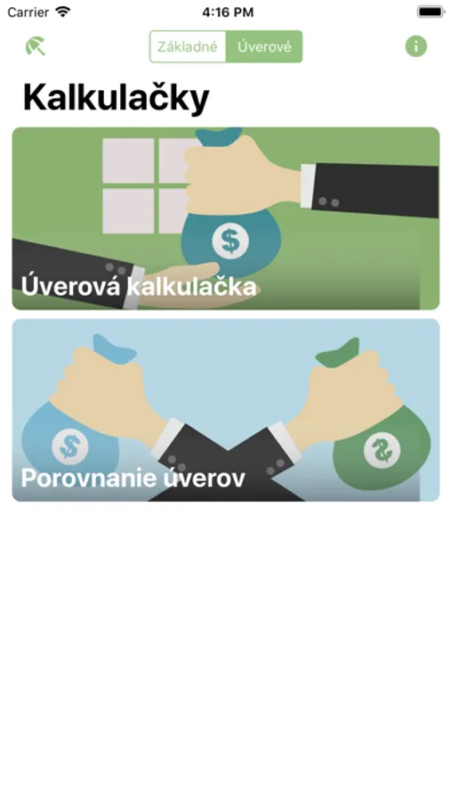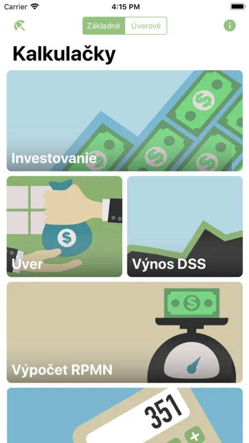 - Základné kalkulačky – obsahujú základné matematické výpočty súvisiace s jednorázovými a pravidelnými investíciami, úvermi, investíciami cez doplnkové dôchodkové spoločnosti a mzdovú kalkulačku rátajúcu čistú mzdu z hrubej mzdy a naopak.