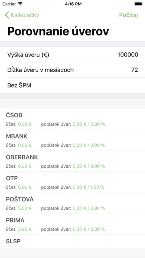 - Úverová kalkulačka – obsahuje porovnanie preplatenia úverov v konkrétnych slovenských bankách podľa ich reálnych poplatkov, spôsobu rátania anuitnej splátky a zohľadňovania štátneho príspevku pre mladých.