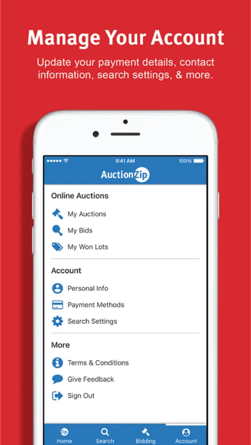 Register, bid, and win items on the go. Plus, manage your payment preferences, account information, search settings, and more.