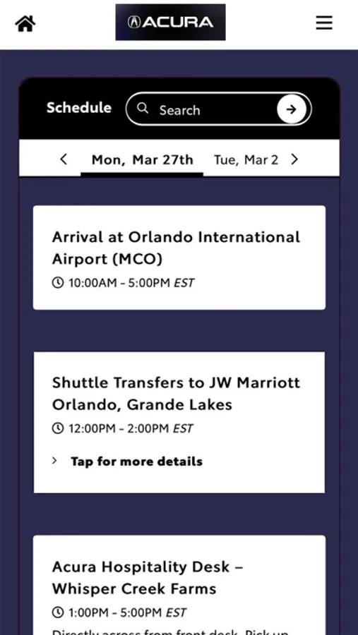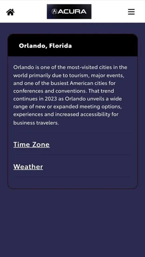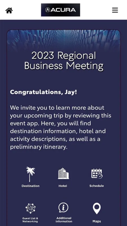 The Acura Events app supports Acura Domestic/ North America events. Only invited attendees may access the application, which will serve as a mobile resource for the event. The app includes a schedule of events, list of attendees, maps, and other important information.