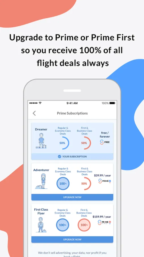 StayCircles Prime and Prime First Subscriptions are available in the Adventure Machine app so you can see 100% of both economy (Prime) or business / first class deals (Prime First). Here is the fine print: "By tapping Upgrade, your payment will be charged to your iTunes account, and your Prime or Prime First subscription will automatically renew for the same length at the same price until you cancel in settings in the iTunes store at least 24 hours prior to the end of the current period. You may manage subscriptions and turn-off auto-renewal by going to your Account Settings after purchase. Any unused portion of your Prime First trial period, if offered, will be forfeited when you purchase. By tapping Upgrade, you agree to our Privacy Policy and Terms."